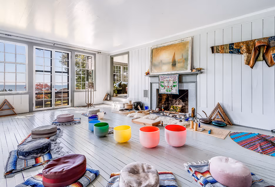 Guests have access to a fully equipped kitchen, waterfront outdoor space with two kayaks and two paddle boards, sauna and hot tub, fire pit, and an indoor yoga, meditation, and breathwork room. Every element of the home has been designed to support both comfort and connection.